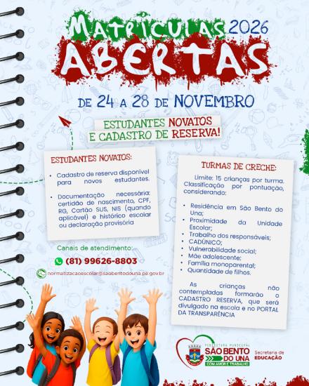 ✍🏻As Matrículas 2026 para Estudantes Novatos e Cadastro de Reserva na Rede Municipal de Ensino começarão em breve!