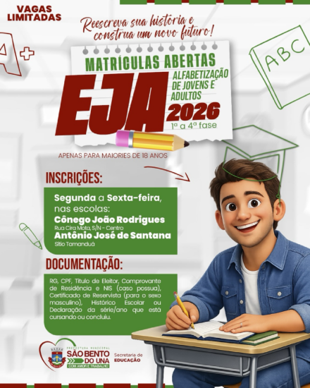 A Prefeitura de São Bento do Una, por meio da Secretaria Municipal de Educação, informa que estão abertas as matrículas para a Educação de Jovens e Adultos (EJA) 2026, da 1ª à 4ª fase.